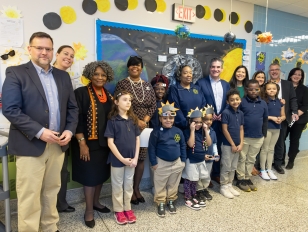 Buffalo Public Schools have been preparing students through a variety of interactive learning opportunities, including essay writing, art making, and trips to Buffalo State’s Whitworth Ferguson Planetarium. The halls of Public School 17 Early Childhood Center—where representatives from Buffalo State and M&T Bank met with students on Friday, March 22 to give out the glasses—are lined with student-created eclipse-related art, writing, and visual aids.