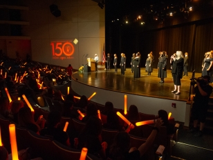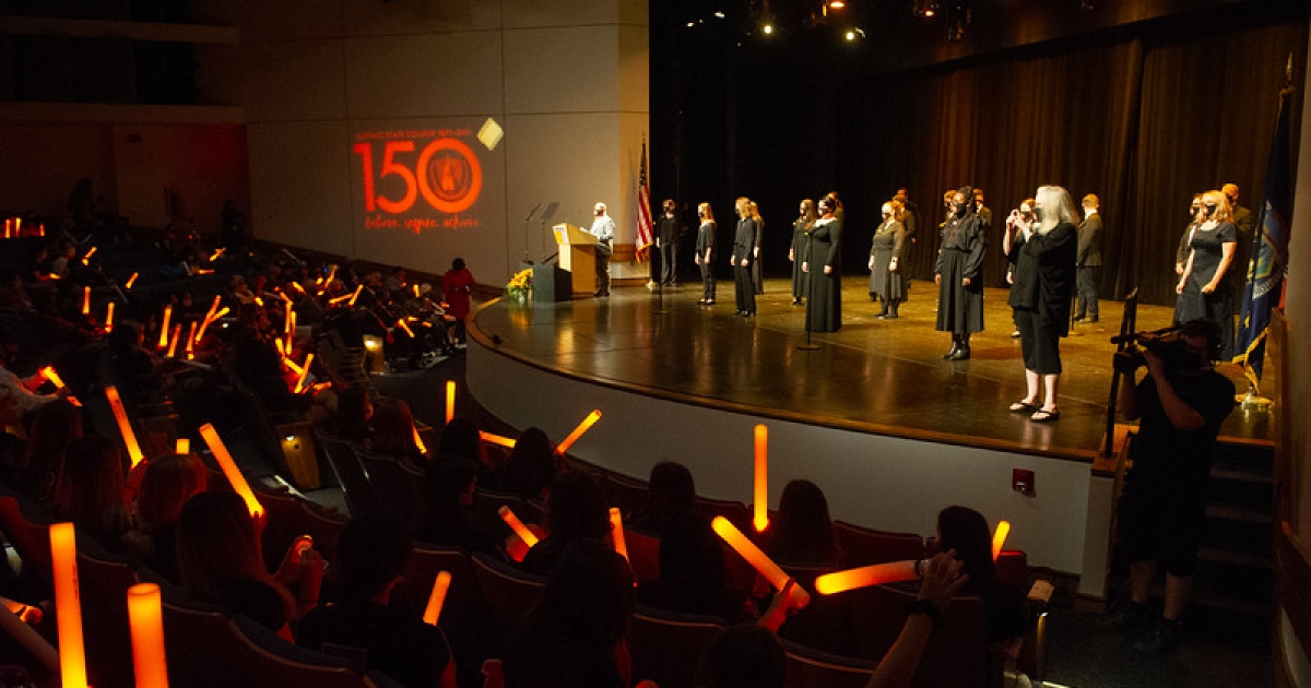 After 70 years, Buffalo State College has a new alma mater. Dawn Pustelnik, audience services manager for the Performing Arts Center at Rockwell Hall, penned the winning lyrics in the alma mater competition and was recognized at the college’s sesquicentennial kickoff celebration—Buffalo State College Day—on September 17. The new song, “Bengal Pride,” performed by Victoria J. Furby, associate professor and chair of the Music Department, and students from the Buffalo State College Chamber Choir, made its debut at the event.