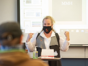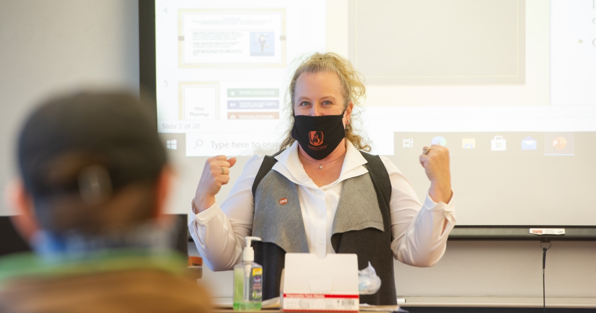 “I have the students wear two pairs of gloves and weighted backpacks to simulate carrying oxygen,” explained O’Neill, ’94, ’04, about her Industrial Hygiene course. “I even pretend to wash them down after it’s over. It brings what we’re reading about industrial spills and accidents in manufacturing to life.”
