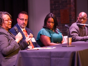 In the afternoon, Buffalo State President Katherine Conway-Turner sat on a panel along with Erie County legislators April Baskin and Howard Johnson, and Luke Carnicelli, principal at Southern Cayuga High School. Buffalo State’s Peter Yacobucci, associate professor of political science, served as the moderator, relaying questions that participants had submitted.
