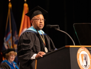 Darren J. Brown-Hall, ’96, ’97, superintendent of the Williamsville Central School District, delivered an inspiring speech to the graduating Class of 2024 during the School of Education’s evening Commencement ceremony on Saturday, May 18. Brown-Hall addressed a full crowd in the Sports Arena for Buffalo State’s 152nd annual Commencement, during which the university conferred degrees on nearly 1,700 undergraduate and graduate students over three ceremonies.