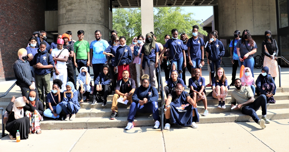 Pictured: Upward Bound students on the steps of Cleveland Circle, taken before one of their field trips, summer 2021.