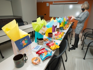 “I was in a meeting with some people from Student Affairs, and they were talking about how a student was waiting for a care package from home, and the package, through no fault of the college, was delayed,” she said. “It made me think of when I was in college, how my aunt and uncle sent me care packages all the time. I thought, why couldn’t we be their family while they’re here and deliver these time-efficient gift bags?”
