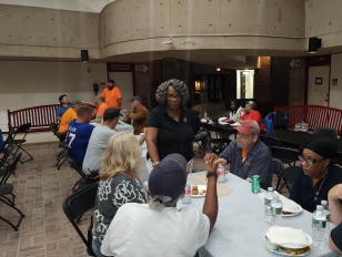 Vice President for Finance and Management Laura J. Barnum joins Buffalo State University staff members at a table during the annual Second-and Third-Shift Pizza Party.