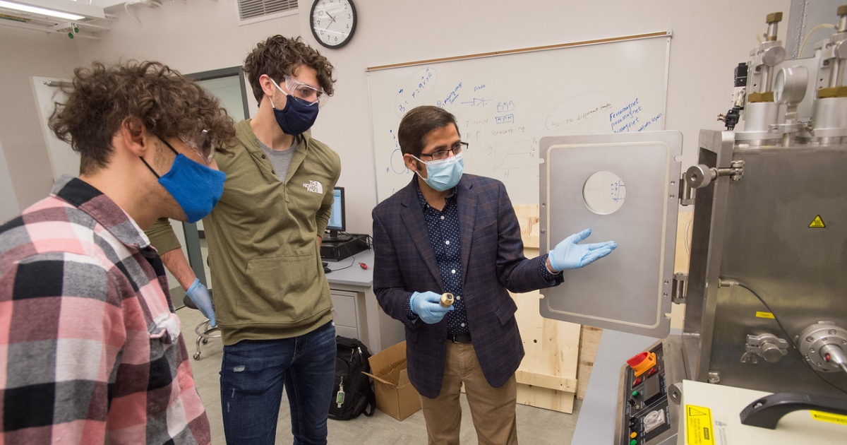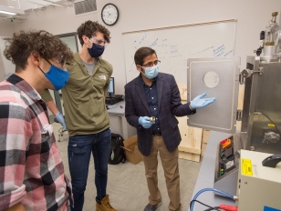 Pictured: Arjun Pathak, Ph.D. (right), assistant professor of physics, works with EURO student researchers Randall Filippone (left) and Liam Hulsebosch in the physics lab at Buffalo State College.